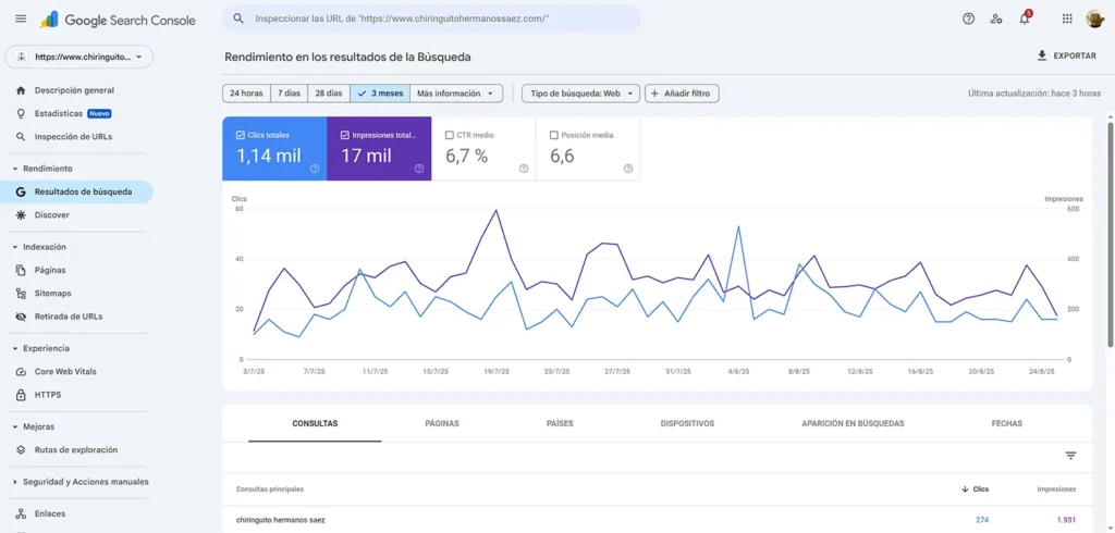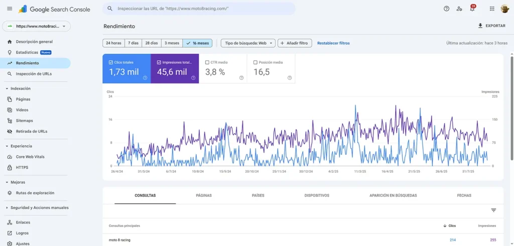 Diseño corporativo en WordPress, estudio de mercado para su sector. En menos de 3 meses las gráficas de GSC son impresionantes.