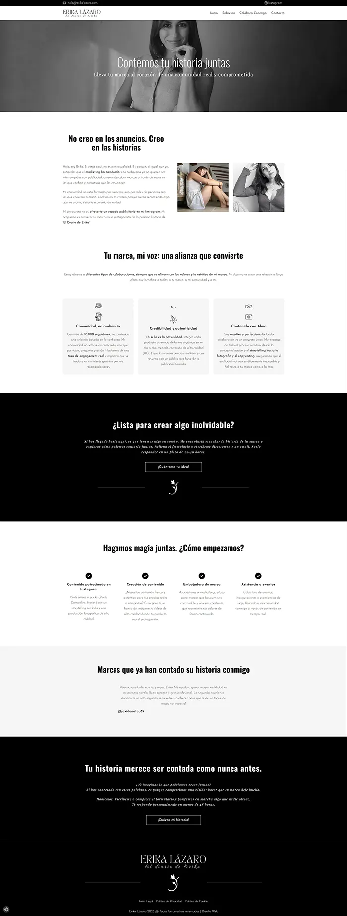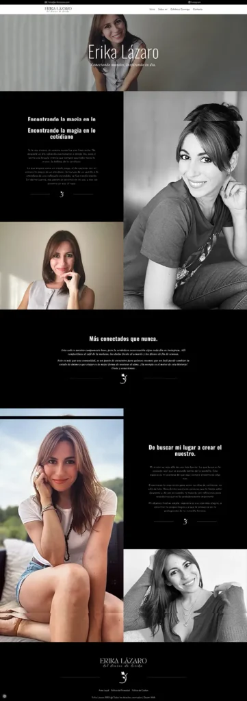 Erika necesitaba una web corporativa para dar a conocer sus servicios de promoción de marcas en Instagram. El resultado es una web muy bonita, jugando con colores en blanco y negro muy elegantes. Sin duda, un proyecto fácil pero al mismo tiempo complicado para coger la esencia de su marca.